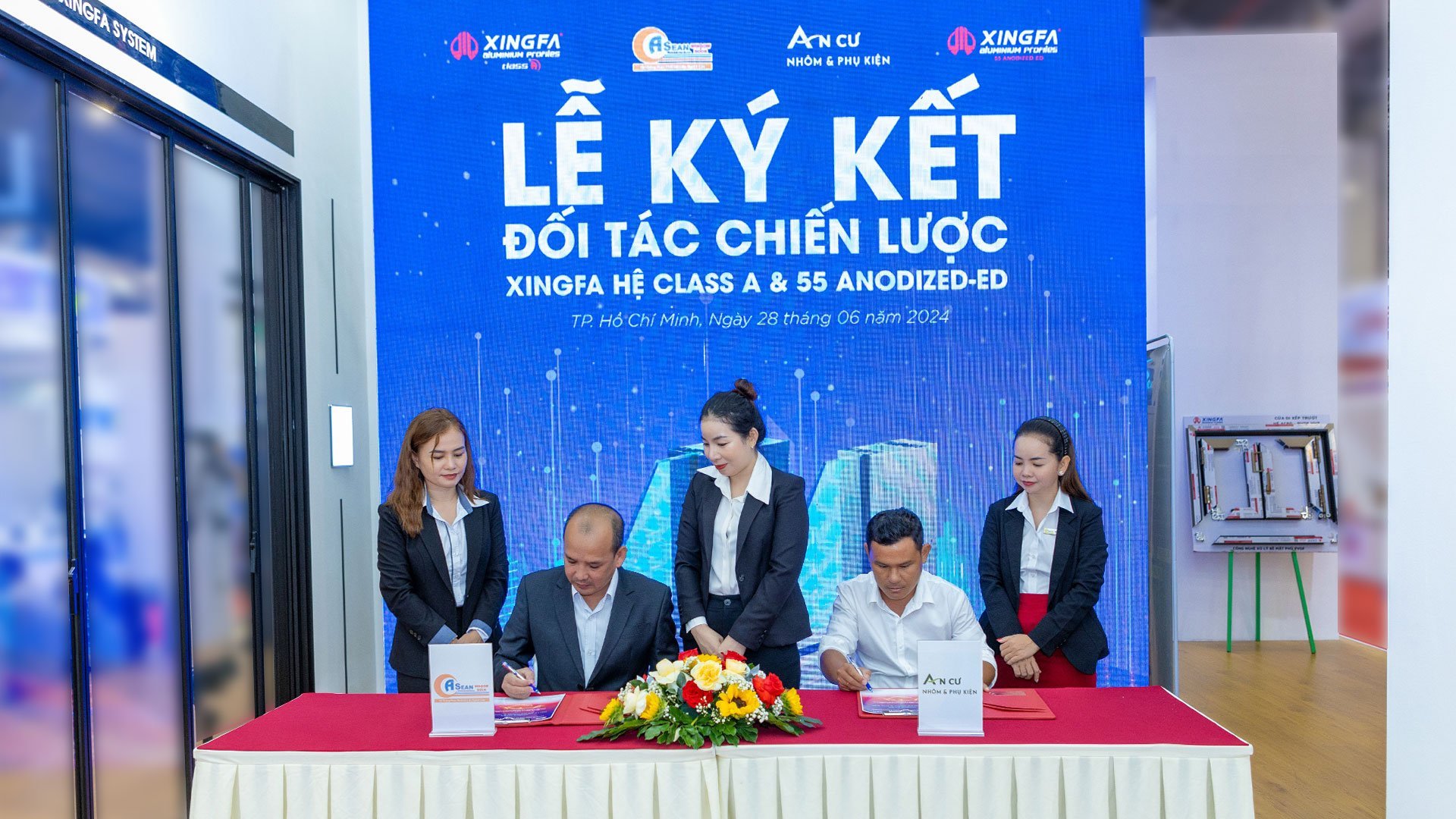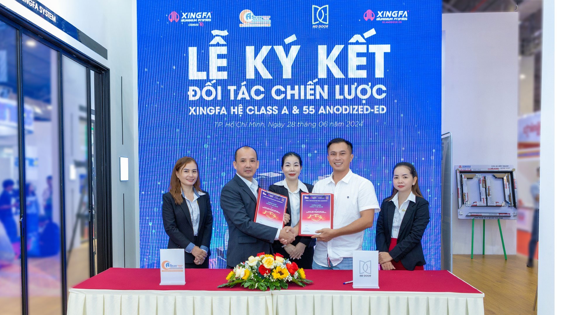 Hòa nhịp xu hướng sản xuất ANODIZED-ED, ngày 28/6/2024, tại gian hàng Xingfa Quảng Đông, ASEANWINDOW tổ chức Lễ ký kết đại lý – Đơn vị sản xuất chiến lược Xingfa hệ Class A, Xingfa hệ 55 ANODIZED-ED với các Đối tác Công ty TNHH Xây Dựng TMDV Nhân Tâm (Stardoor), Công ty Tiến Hưng, Công ty Tiến Đạt, Công ty TNHH TMDV Xây Dựng Hưng Long; Công ty MD DOOR, Công ty TNHH Xây Dựng Lê Toàn, tiếp tục khẳng định mối quan hệ hợp tác bền vững cùng phát triển giữa các bên.